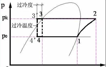 過冷是為了使節(jié)流前的制冷劑液體減少在節(jié)流過程中產(chǎn)生的閃發(fā)氣體,減少閃發(fā)氣體所占容積的比容,提高單位制冷量;同時(shí)也提高了回氣的過熱度,對(duì)保護(hù)壓縮機(jī)不處濕沖程運(yùn)轉(zhuǎn),都有一定的好處。過冷度在壓焓圖的表示: