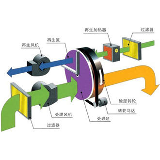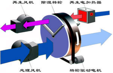 當(dāng)處理空氣通過轉(zhuǎn)輪的處理區(qū)域時,其中的水蒸汽被轉(zhuǎn)輪中的吸濕介質(zhì)所吸附,水蒸氣同時發(fā)生相變,變?yōu)橐簯B(tài)水,并釋放出潛熱;這時,處理空氣因自身的水份減少而變成干空氣;之后,處理空氣由處理風(fēng)機送出,變成干的、熱的空氣。
